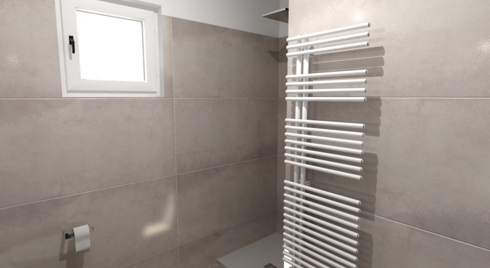 Realizzato con un formato a parete 120x60 Entropia bianco che pur essendo il bagno di piccole dimensioni la resa finale tende ad allargare l'ambiente, il pavimento 20x120 Noon Ember finto legno invecchiato segue la pavimentazione per tutta la casa